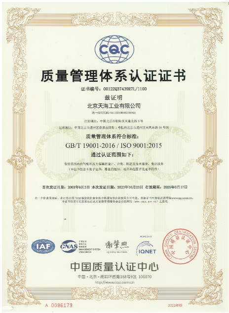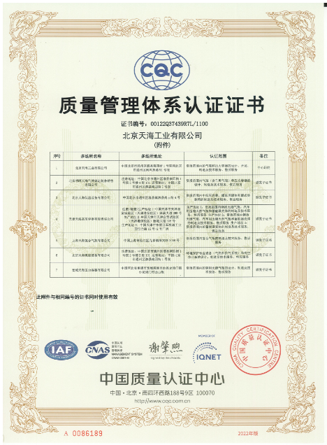 2010年9月,天海工業(yè)為保證品牌質(zhì)量,保證產(chǎn)品一致性,建立了集團一體化ISO9001質(zhì)量管理體系,通過中國質(zhì)量認證中心的集團式認證并取得證書。